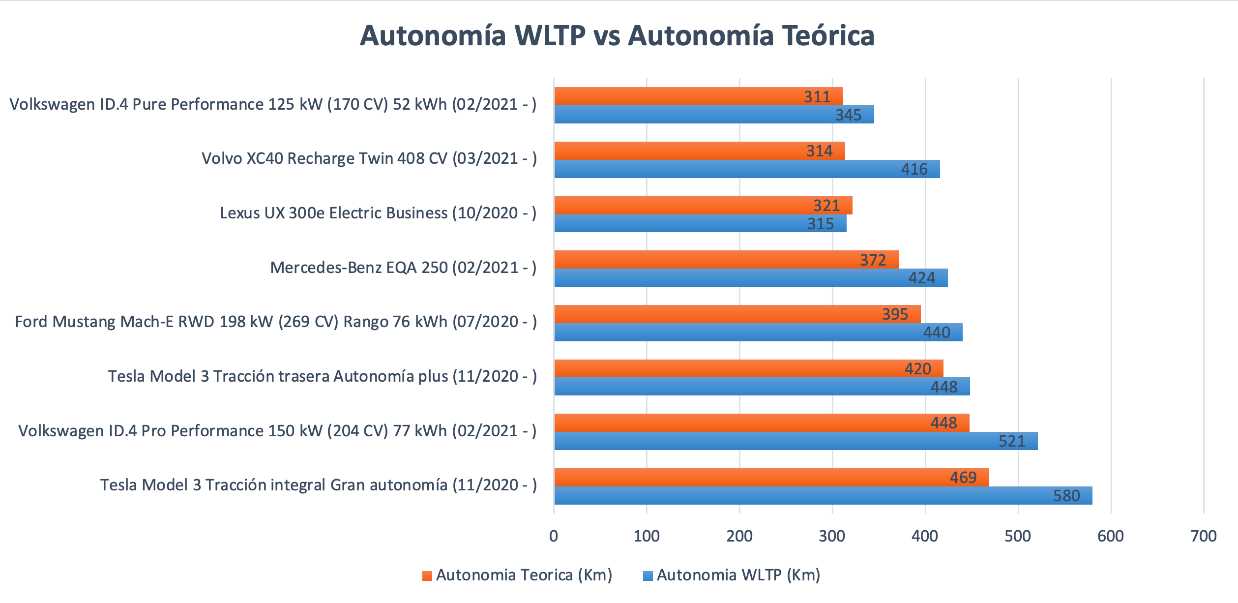 Si observamos la tabla adjunta en la que se comparan los datos de otros vehículos eléctricos similares, podemos observar que estos tienen autonomías teóricas muy inferiores a lo homologado en ciclo WLTP.