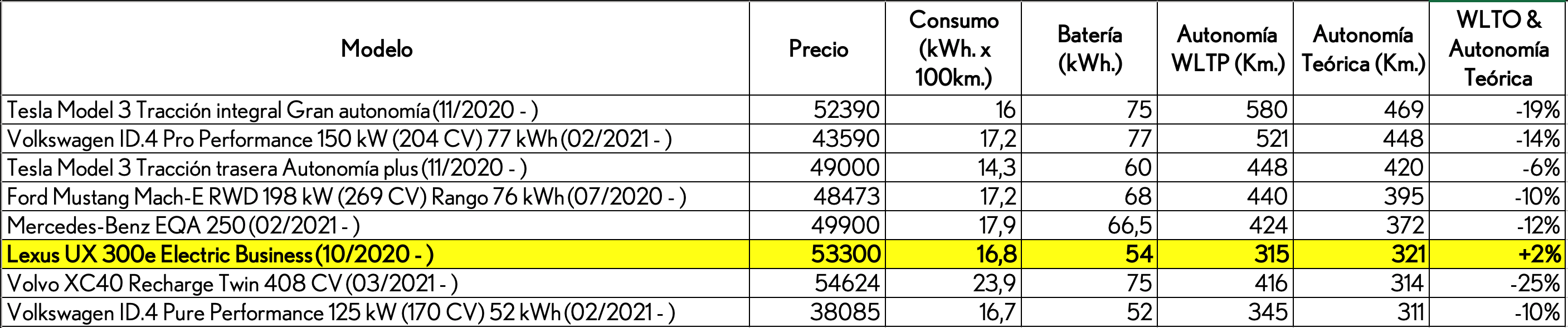 Si tomamos como ejemplo el Lexus UX300e, la autonomía oficial en ciclo WLTP es de 315km. El consumo homologado en kWh. a los 100 km. es de 16,8 kWh. x 100 km, lo que quiere decir que si la capacidad de la batería es de 54 kWh, la autonomía teórica total debería ser 54kWh / 16,8kWh x 100km , siendo este dato de 321km, por tanto, perfectamente alineado con la autonomía reportada.